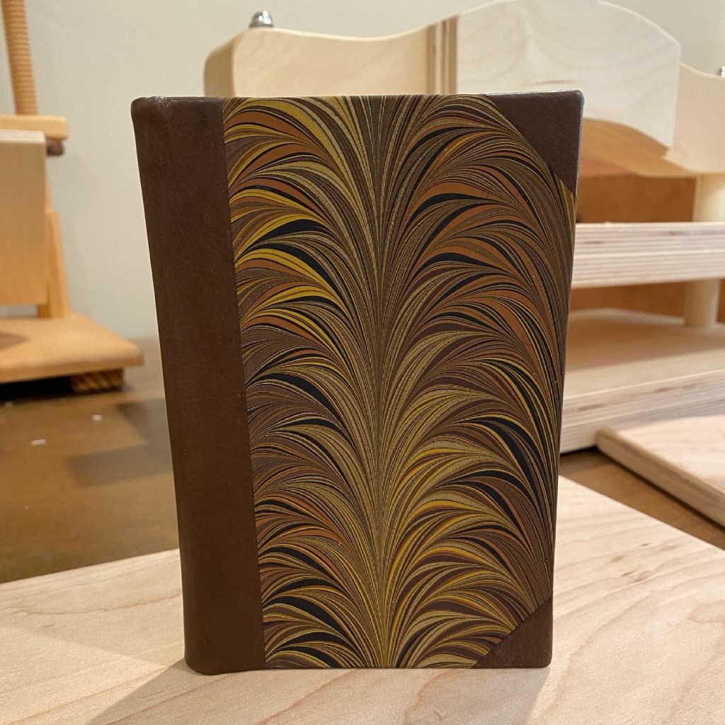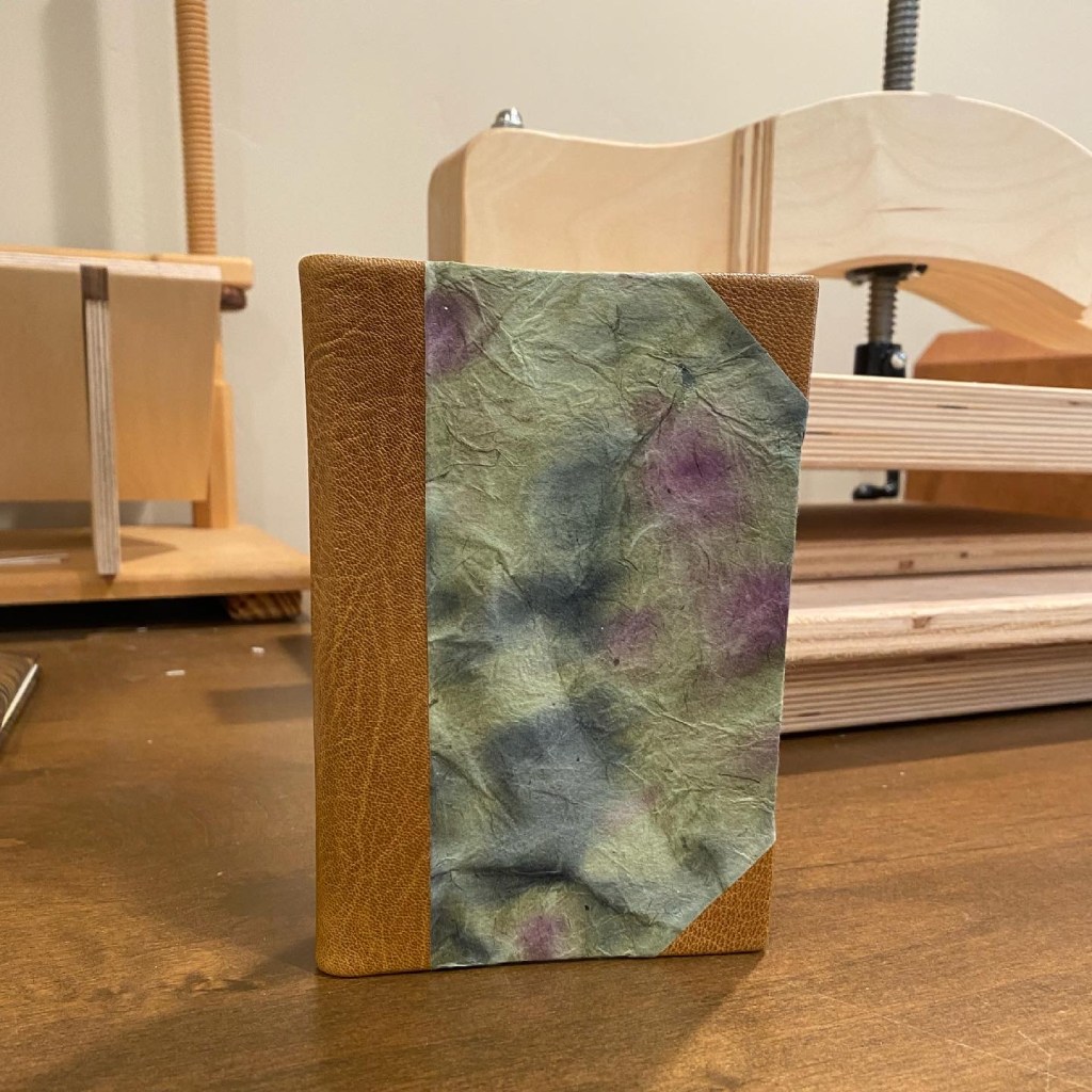 I still have about four more books to bind. It was fun setting up the binding process and breaking up the work into separate pieces. I sewed them together, forwarded them together, cut the pieces for all the cases, but then would have to make each case separately and case them in one by one. I might change that workflow with the next project.