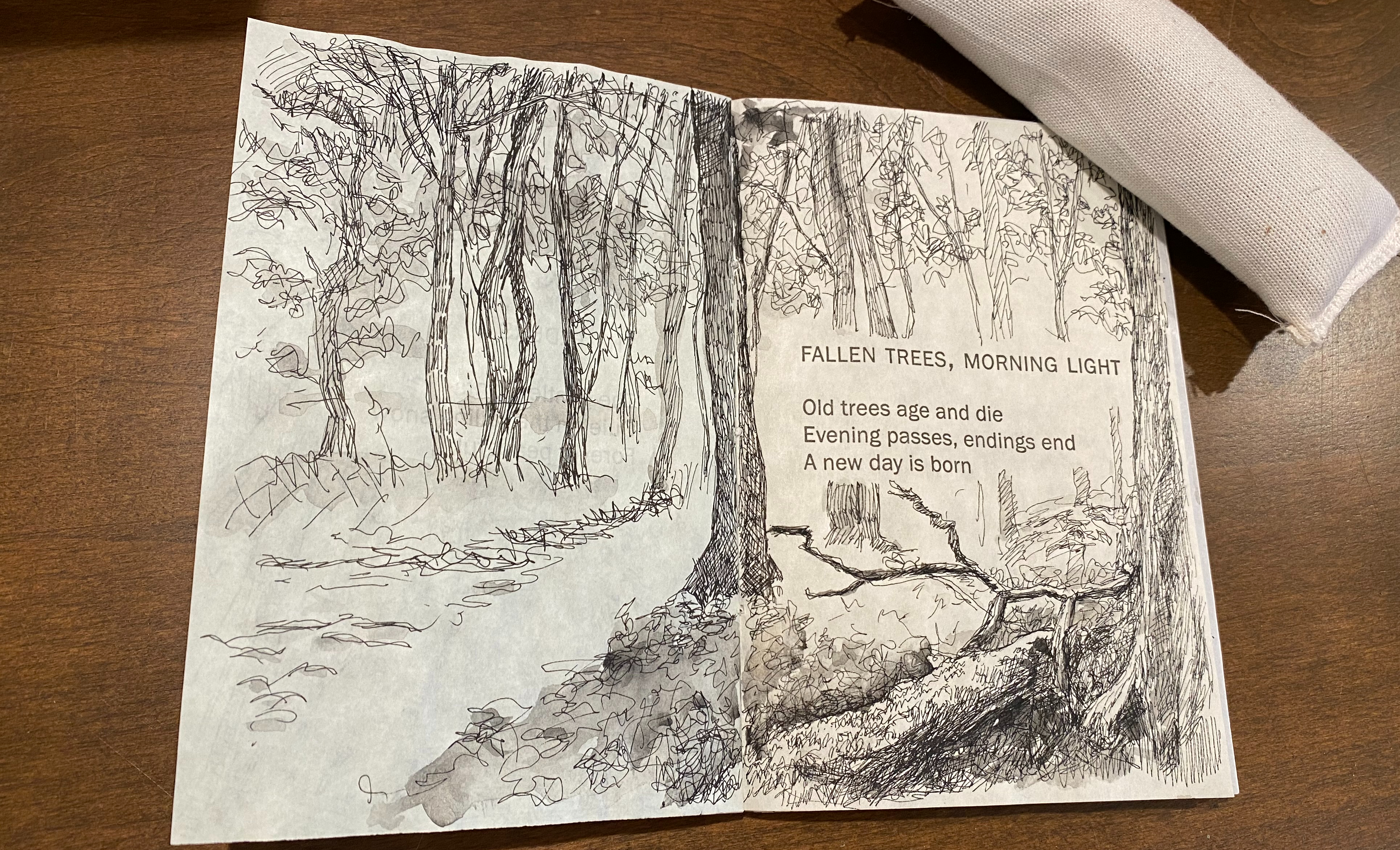 I printed my first small book project on the Chandler and Price. It was a small book of haiku written by my husband. For his birthday, I asked my brother-in-law, Roger Dolin, a muralist and artist in L.A., to hand illustrate some of the poems in a single edition of the book.