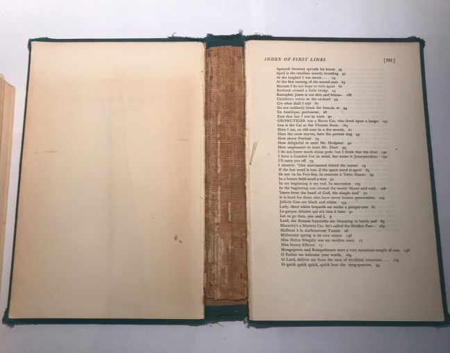 This was a project to do basic book repair on a cloth book. This book was selected from a somewhat random pile of cloth-backed books in need of repair that my teacher, Juliayn Coleman, brought in to our class a few months ago. The first step was to take full stock of the condition of … Continue reading Cloth Book Repair Project
